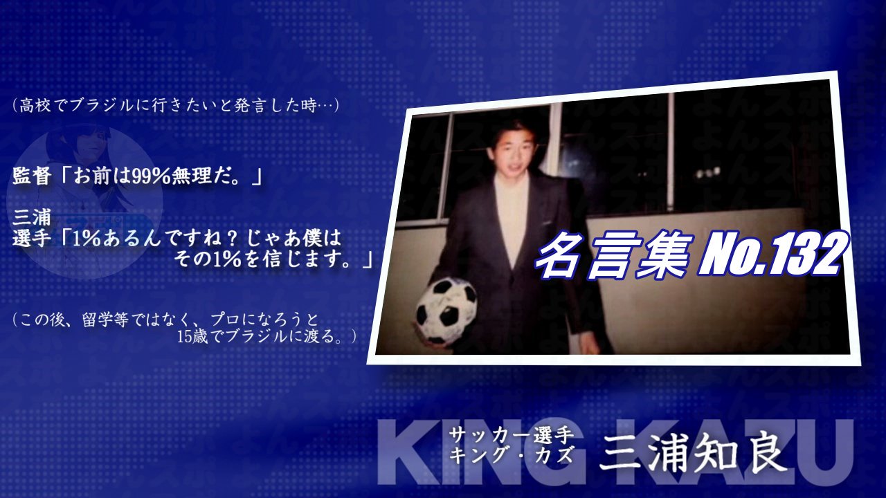 連絡用よんよん 名言集 No 132 指導者 サッカー選手 キングカズ 三浦知良 高校でブラジルに行きたいと発言した時 監督 お前は99 無理だ 三浦選手 1 あるんですね じゃあ僕はその1 を信じます この後 留学等ではなく プロになろうと15